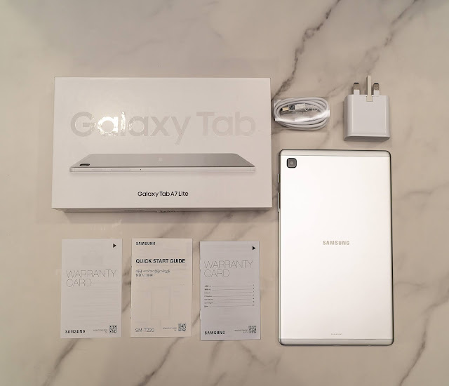 The Galaxy Tab A7 Lite comes with the Quick Start Guide, Warranty Card, Regional Lock Guide, an Ejection Pin, a Charging Cable, and a 15W Super Fast Charging Adapter too!